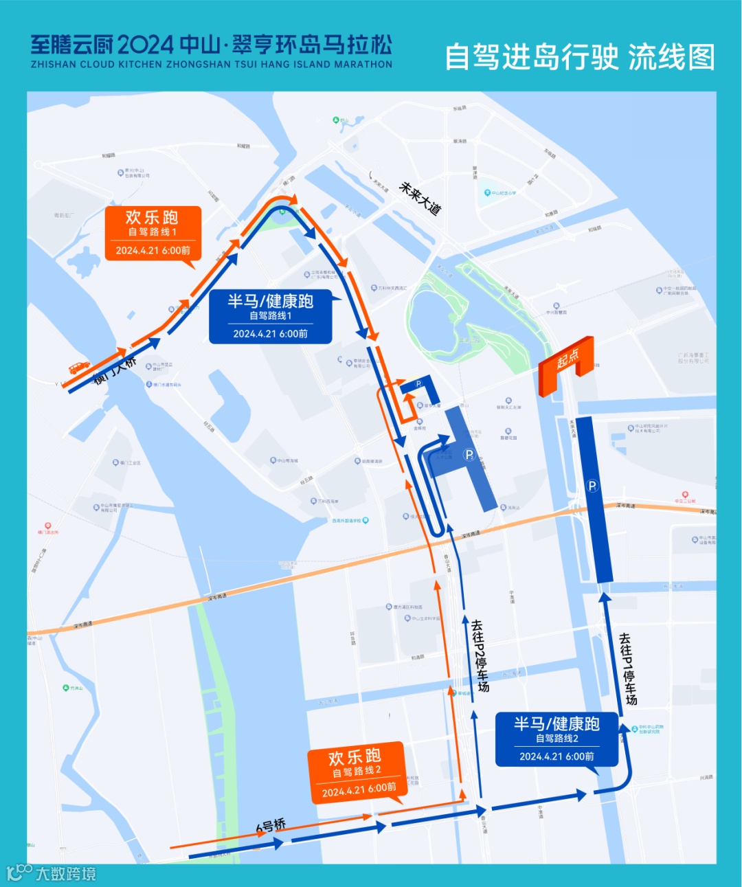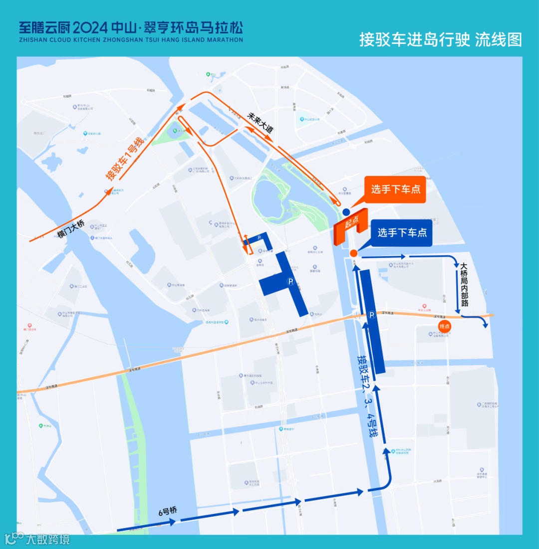 注:请广大自驾与网约车进岛的跑友,须在6:00前到达相应停车点
