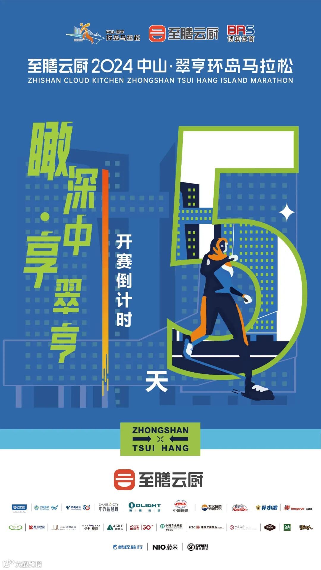 右半部分则在顶部左侧印有赛事logo的整体形象——赛事logo设计中的背景元素,结合了未来之门和深中通道的这两个具有代表性的地标建筑,而下方的跑道则由奔涌的伶仃洋海水化用而来,整个设计都紧扣“瞰深中·享翠亨”的赛事主题,将翠亨新区的现代化城市形象展现的淋漓尽致;顶部右侧印有2024翠马的总冠名——至膳云厨,共同助力翠马赛事的圆满成功。