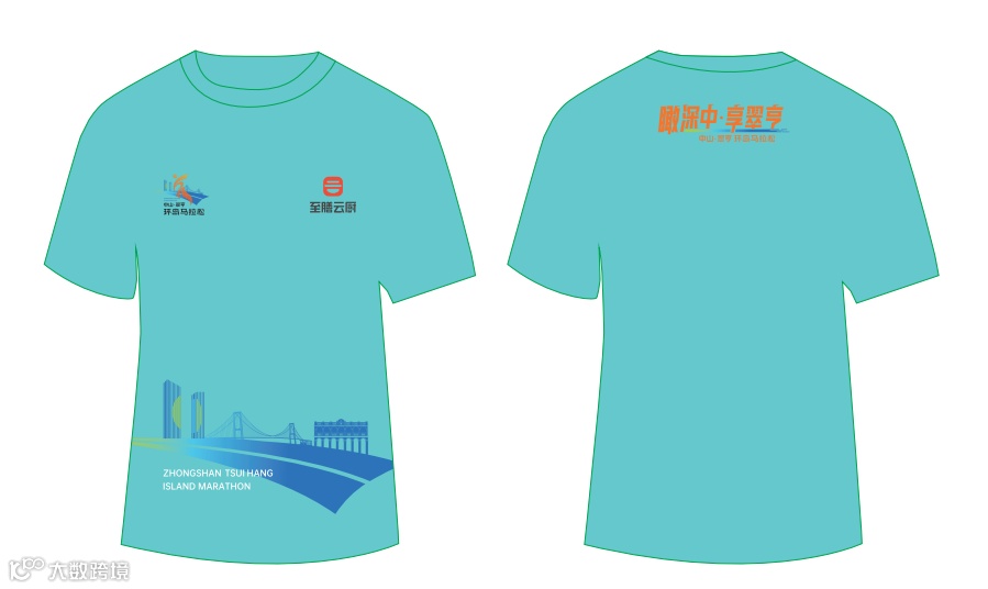 参赛服的设计选用了和主KV颜色一致的海蓝色,象征中山翠亨向海发展,海阔天空任高飞的发展之势,服装画面与赛事主KV保持了高度统一,将未来之门、深中通道、孙中山故居这些标志性建筑的形象简洁、生动刻画并展现;参赛服正面左右两边分别印有赛事logo以及总冠名logo,背面印有本次赛事的主题口号“瞰深中·享翠亨”,将本次赛事的主要元素贯彻到底。