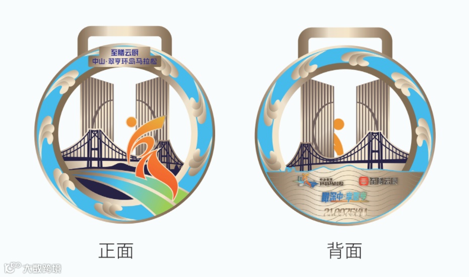 奖牌采用简洁大气的立体镂空设计,画面整体也重组翠亨新区最具代表性的地标性建筑——未来之门及深中通道,展现出双面设计的巧思。从奖牌正面来看,代表着翠亨新区的跑者正在以飞驰的姿态冲向未来;从奖牌的背面来看,跑者正在以小心探索、大胆前进的姿态开启未来。正反两面的画面,巧妙融合翠亨新区地域特色,互为呼应,整个奖牌非常具有观赏性。