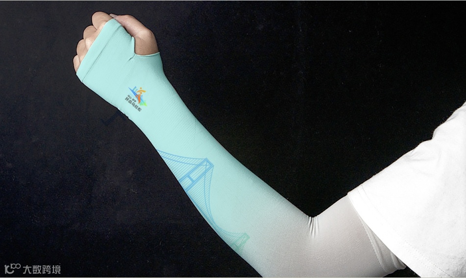 参赛冰袖的设计上采用渐变色的清新色调,颜色自上而下逐渐变浅过渡到白色,为参赛选手的防晒工作保驾护航。同时在靠近手腕处印有本届赛事logo,与参赛服、参赛包等相呼应;延伸下来的是深中通道这一标志性建筑,在保证功能性的同时兼顾美观性。