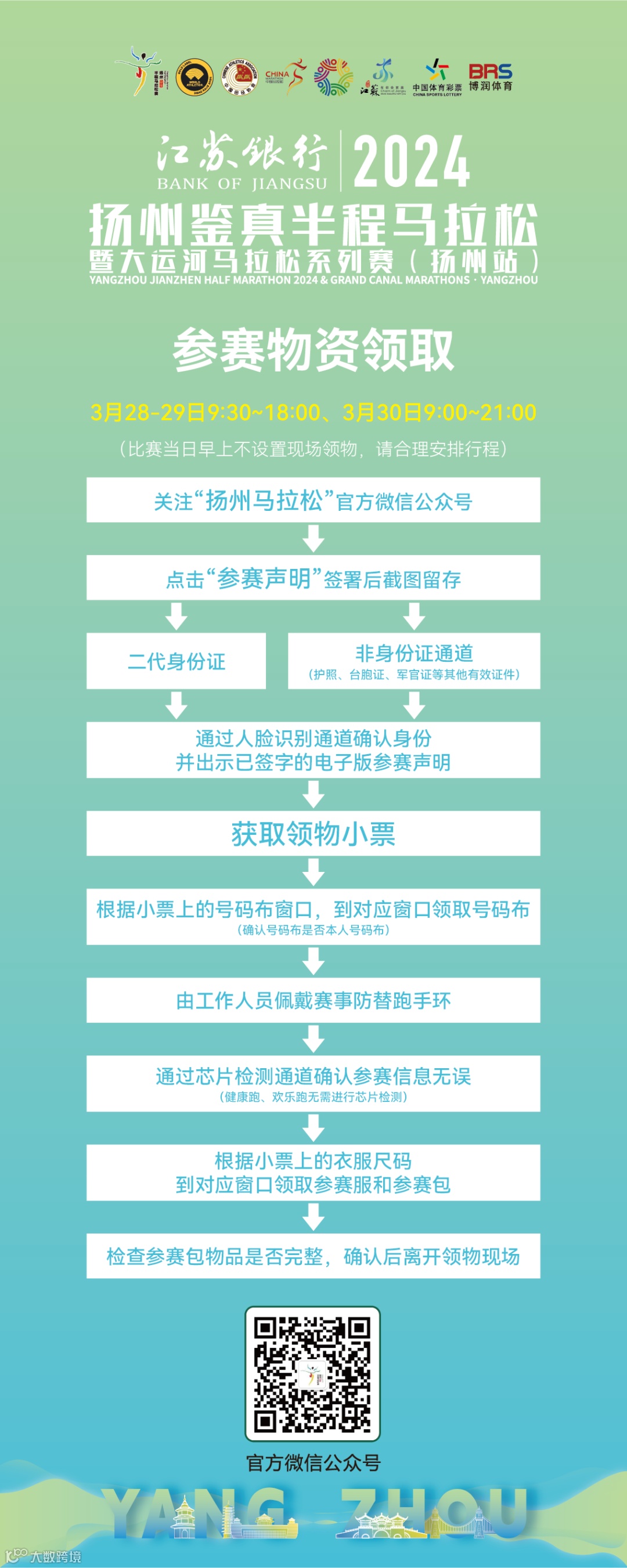 江苏银行·2024扬州鉴真半程马拉松暨大运河马拉松系列赛(扬州站)领物将采取「分时预约」的方式,严格控制现场的人员规模密度。(先预约,后领物,未预约到场将无法领取参赛物品。)