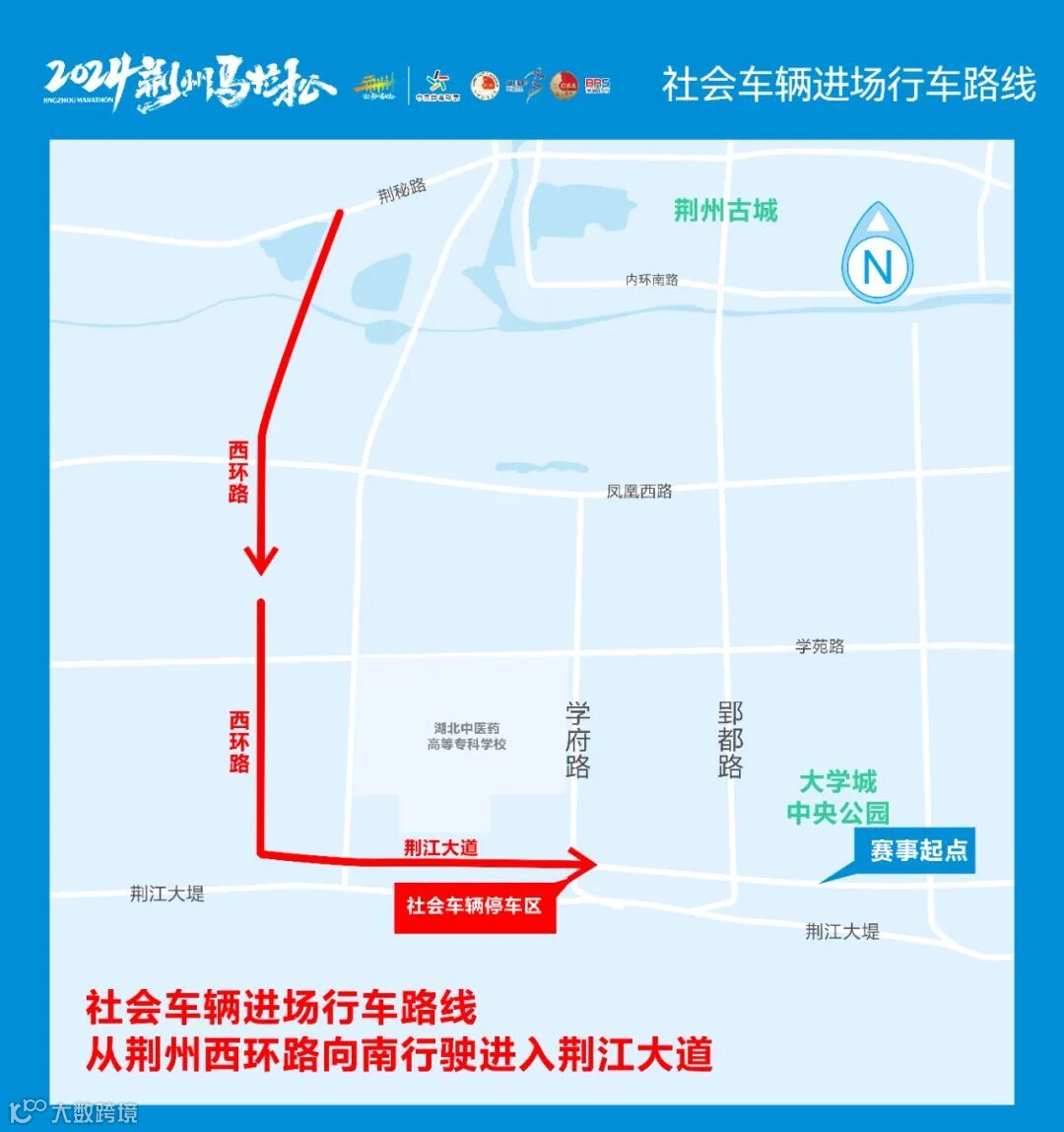二、3月31日6:30起,比赛路段分时段实行交通管制,请自驾车参赛选手提前规划好车辆路线,自驾选手进场行车路线见下图所示。起点自驾车和跑团大巴等社会车辆停车区将设置在郢都路与西环路之间的荆江大道道路两侧,具体位置可扫码下图二维码扫码查看导航。但起点周边停车位非常有限,建议参赛选手尽量选择乘坐选手接驳大巴及公共交通出行。