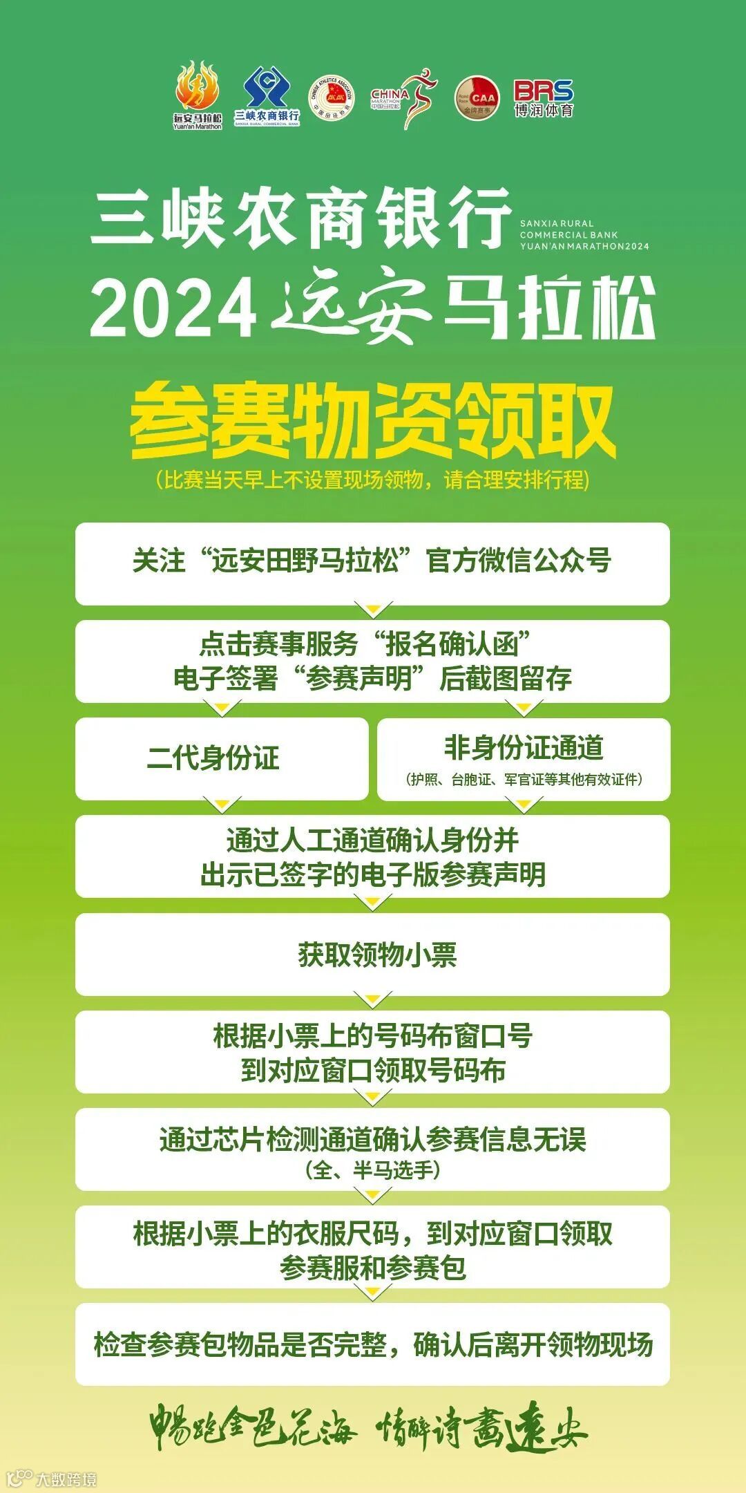 2、凭号码布领取完赛纪念奖牌和完赛包,如遇领取人数较多,请有序排队;