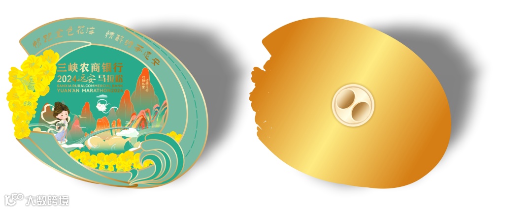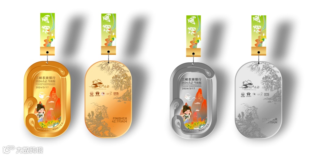 完赛奖牌为无事牌的形状,寓意着奔跑致远、安全而归。正面前景为油菜花海、远景为丹霞地貌,山间祥云片片,外圈以沮水波纹环绕,象征着母亲河沮河孕育了远安这一宜居之地,山水之间尽显诗情画意;奖牌背面以精细的浮雕工艺刻画出田园乡村、绿林生态、地貌奇观等秀美景色,也反映了远安这一千年古县的历史脉络与创新发展之路。