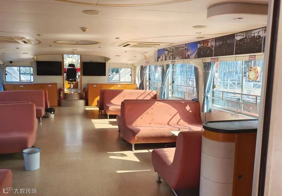 游客们站累了也可以坐在船舱内,看两岸霓虹闪烁,享受静谧天地。东江游船共有三层,除了顶层甲板外,一、二层都有雅座可供休息。