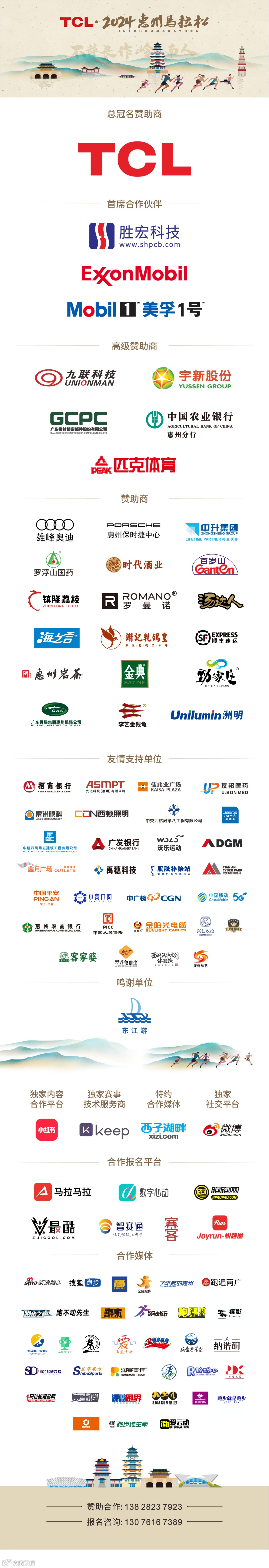 2.半程马拉松(21.0975KM):云山西路(出发点)→文明一路→三新南路→文昌二路→东江一路→东江二路→东江三路(折返)→东江二路→东江一路→文昌二路→惠州大桥→环城西路→塘尾街→水门路→中山南路→中山东路→东新桥→新民后街→下塘街→滨江东路→东平路→东江大桥→惠州大道→菊花二路(折返)→文昌一路→云山西路→惠州体育馆(终点)。