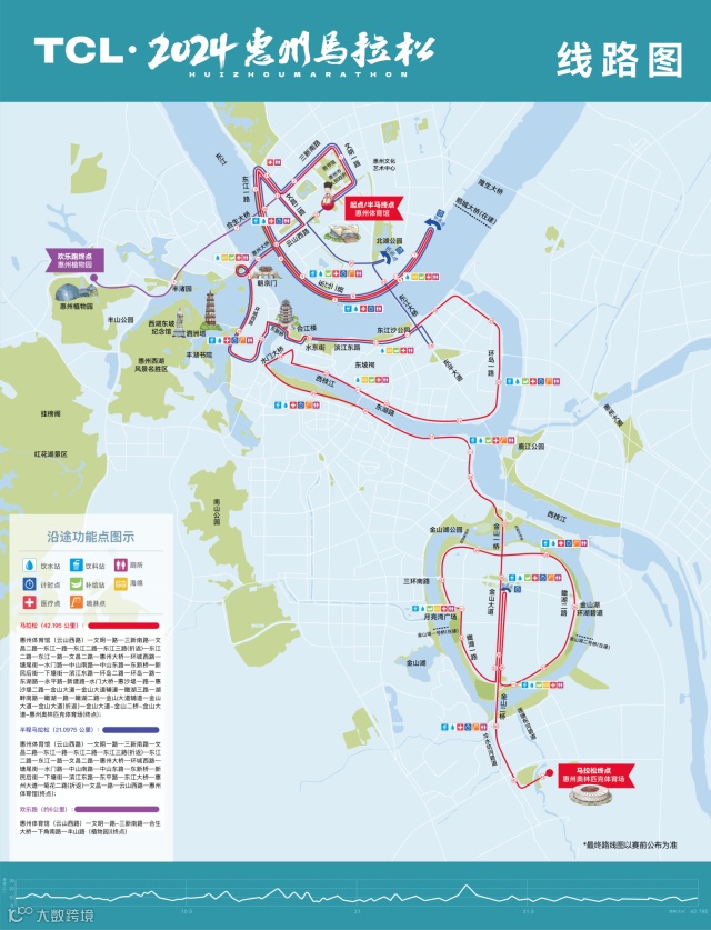 1.全程马拉松(42.195KM):云山西路(出发点)→文明一路→三新南路→文昌二路→东江一路→东江二路→东江三路(折返)→东江二路→东江一路→文昌二路→惠州大桥→环城西路→塘尾街→水门路→中山南路→中山东路→东新桥→新民后街→下塘街→滨江东路→环岛二路→环岛一路→东湖路→永平路→新建路→水门大桥→惠沙堤一路→惠沙堤二路→金山大道→金山大道辅道→瞰湖三路→湖畔南路→瞰湖一路→瞰湖二路→金山大道辅道→金山大道(折返)→惠州奥林匹克体育场(终点)。
