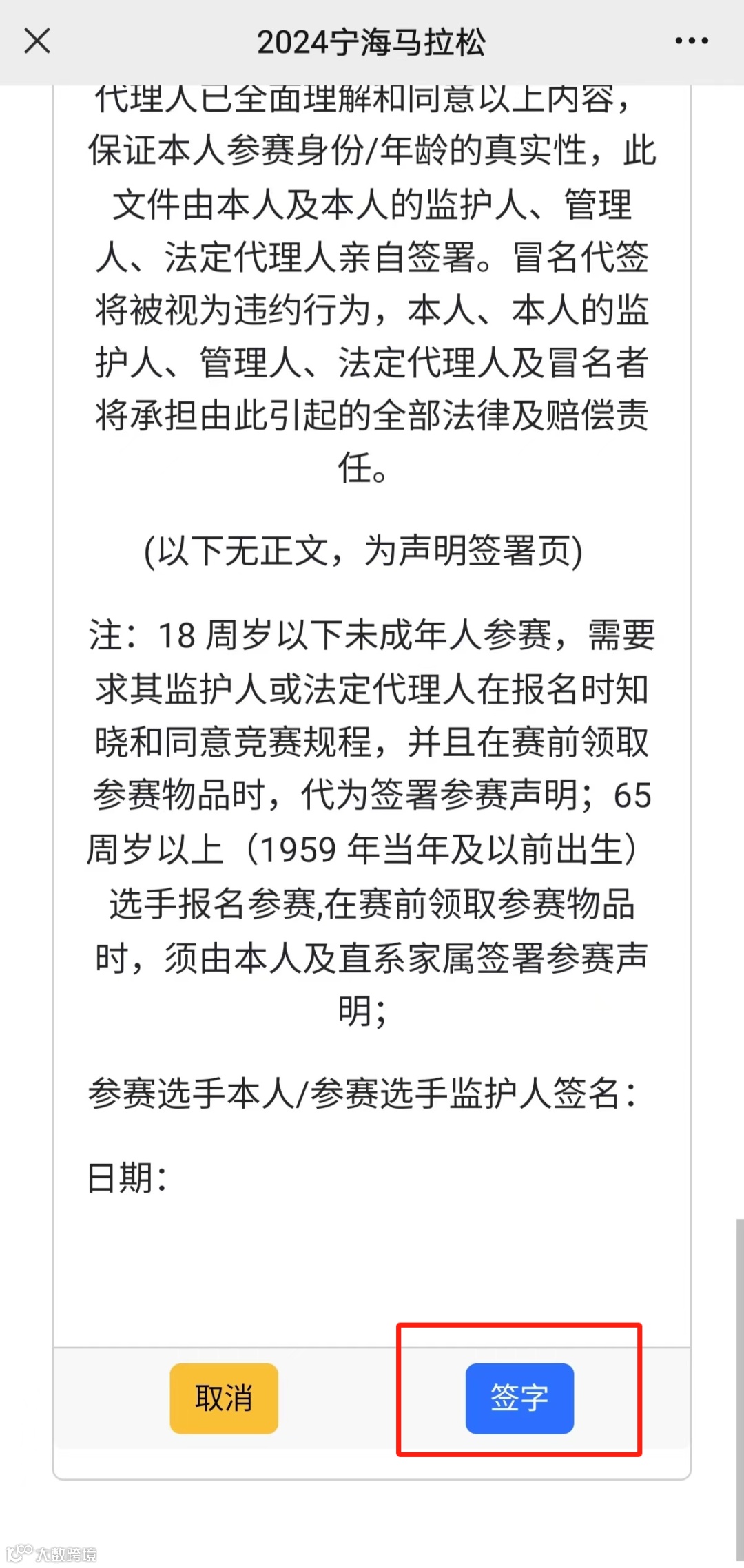 第一步:①扫描下方二维或进入宁海马拉松微信公众号-》点击最下方参赛声明-》输入证件号-》仔细阅读内容后签字,进行线上电子签署后请截图留存。