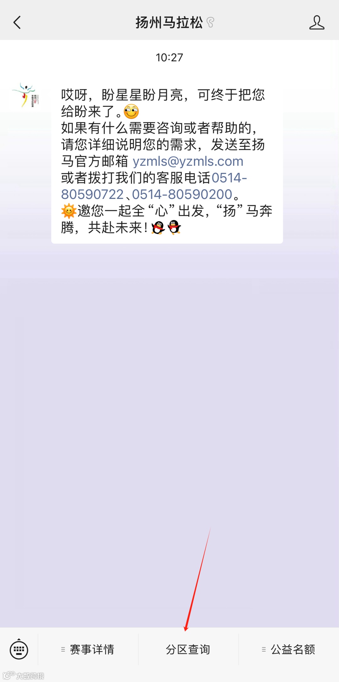 步骤一:关注“扬州马拉松”官方公众号,点击菜单栏“分区查询”