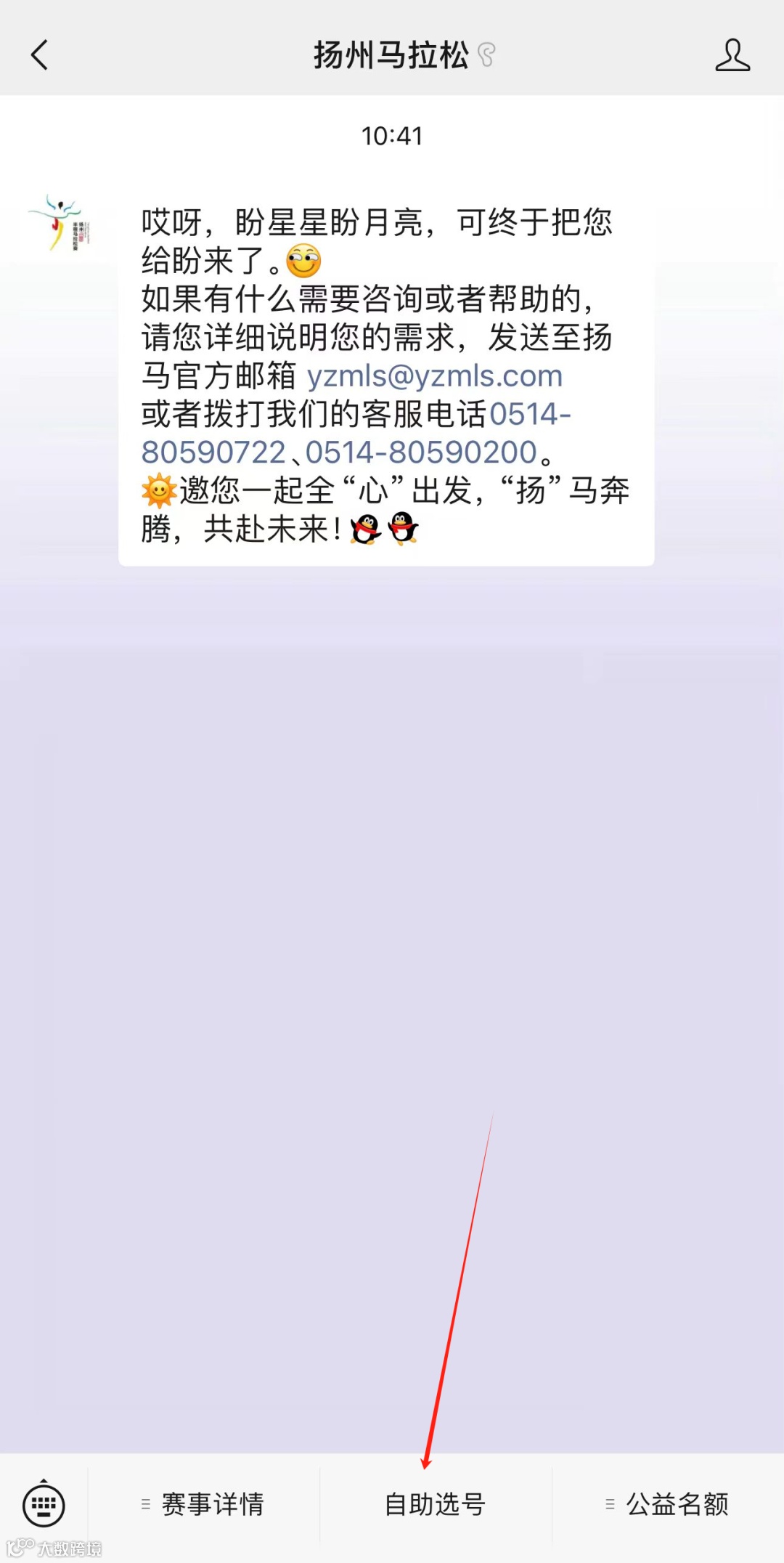 步骤一:关注赛事公众号“扬州鉴真半程马拉松”,点击“自助选号”,号码一旦选定,无法更改。