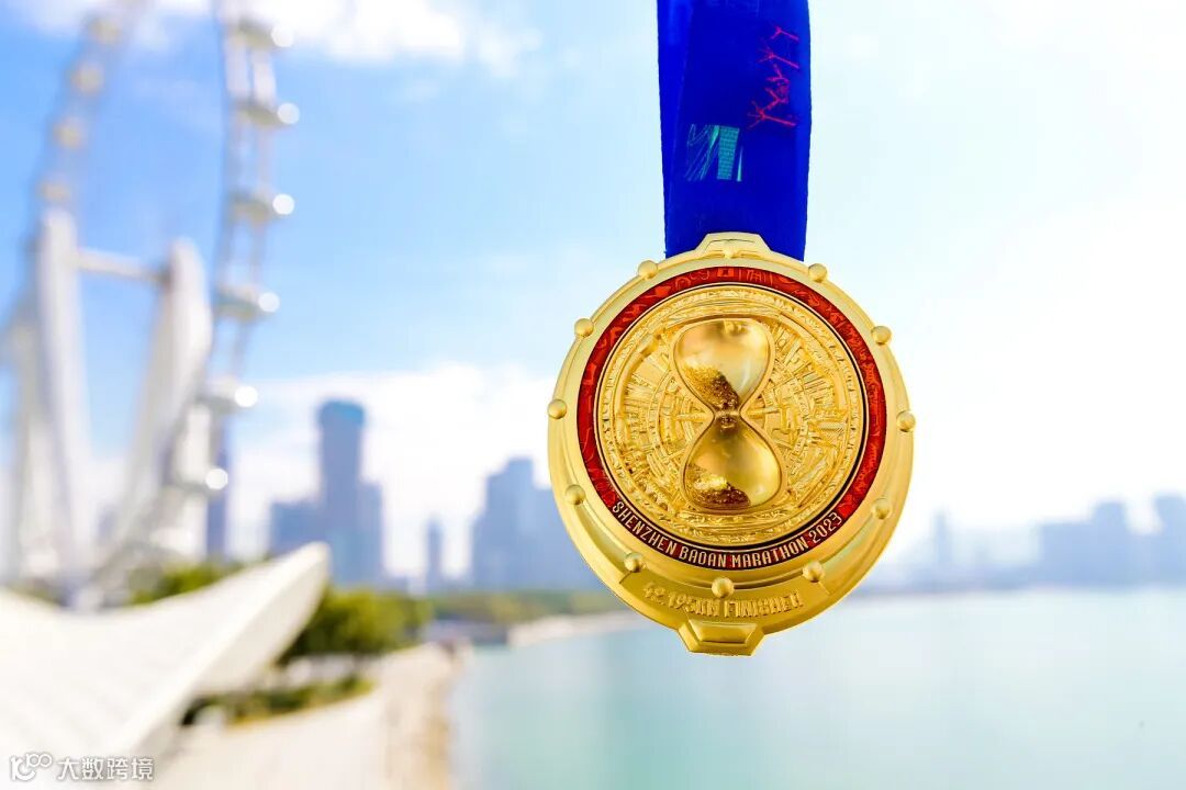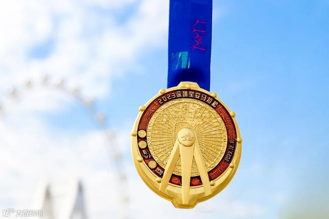 本次赛事的完赛奖牌名为“时光印记”,设计理念围绕着宝安的过去、现在与未来,奖牌正面整体以屹立于城市之巅的湾区之光摩天轮为主体。透过摩天轮,可以看到篆刻着无数相同又不同的“宝安”字体。不仅寓意着宝安的不断更新、不断变化,也隐喻着各行各业的宝安人汇聚于此,共同组成现在的宝安。