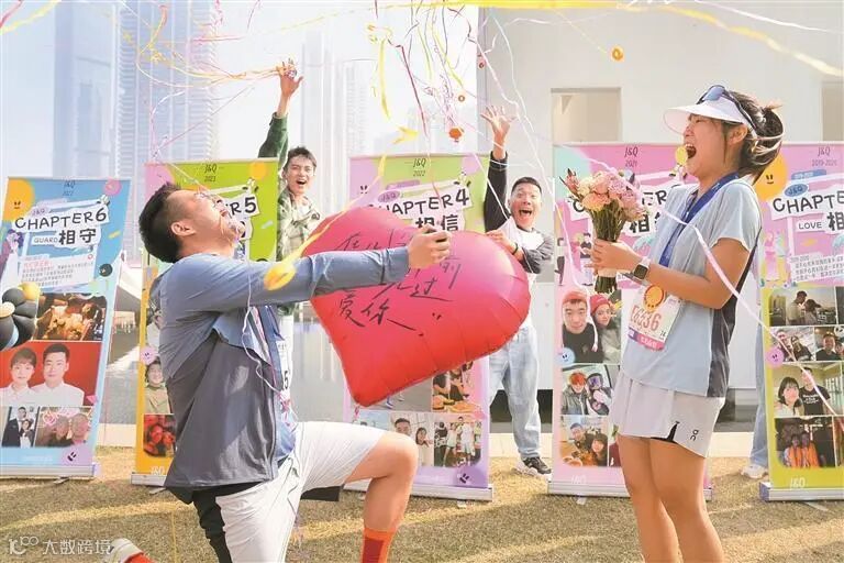 求婚的小伙叫区俊杰,与女友陈琼在2019年相遇在健身房,两人因运动相识相知相爱。2023年,两人和家人都报名参加了“宝马”,但只有陈琼和哥哥中了签。“‘宝马’是在2023年的最后一天举行,我觉得特别有意义。2023年我们完成了很多大事,确定要携手共度一生,所以想在这天完成求婚,2024年开启全新的生活!”区俊杰说,为了这一天自己做足了功课,准备了很多环节,让求婚仪式幸福感满满。