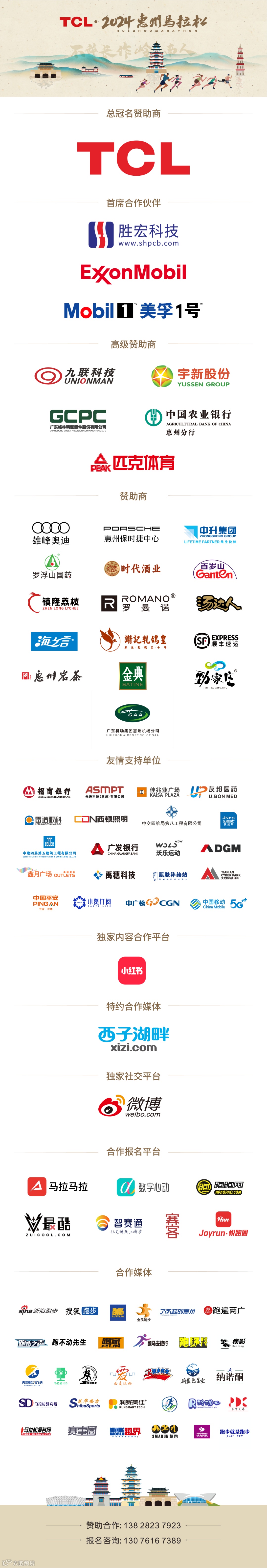 一场城市马拉松的举办,得益于政府主导、社会支持、市民参与。发布会现场,惠马组委会与TCL实业控股股份有限公司签署了赛事冠名协议,与胜宏科技、埃克森美孚签署“首席合作伙伴”协议,与九联科技、宇新化工、格林精密、中国农业银行惠州分行、PEAK体育签署赛事赞助协议,并对各大赞助商所作出的突出贡献表示感谢。