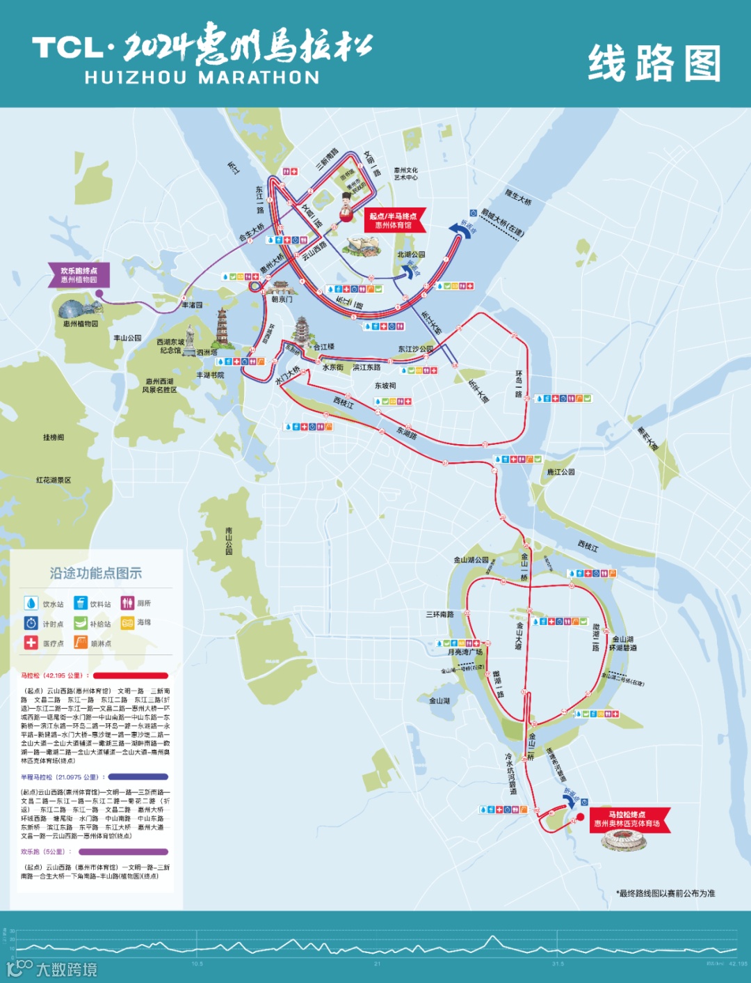 本次赛事路线穿越惠州千年历史,从江北CBD的惠州体育馆开跑,沿途经过惠州大桥、朝京门、惠州西湖、合江楼、水东街、东坡祠、水门桥、金山湖、惠州奥林匹克体育场等古街、新城景观及地标建筑,可谓“一步一景”,移步换景,整条赛道充分呈现“古今同辉”“山水相依”的惠州城市魅力。