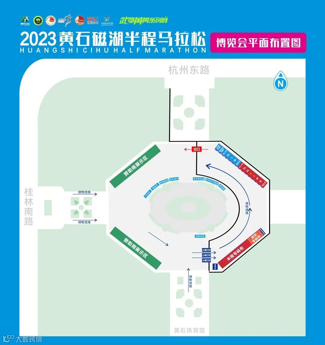 请按图中箭头方向前进,并到对应区域领取参赛物品
