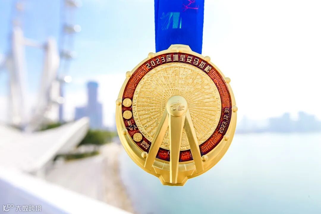 本次赛事的完赛奖牌名为“时光印记”,设计理念围绕着宝安的过去、现在与未来,奖牌正面整体以屹立于城市之巅的湾区之光摩天轮为主体。透过摩天轮,可以看到篆刻着无数相同又不同的“宝安”字体。不仅寓意着宝安的不断更新、不断变化,也隐喻着各行各业的宝安人汇聚于此,共同组成现在的宝安。奖牌背面是以机械齿轮为背景的时光沙漏,轮盘边缘雕刻着永兴桥、羊台山、宝体中心、宝安机场、深圳国际会展中心、湾区之声滨海艺术中心、深中通道等宝安著名地标建筑。寓意着宝安不忘初心,引领着粤港澳大湾区及深圳一起走向未来。