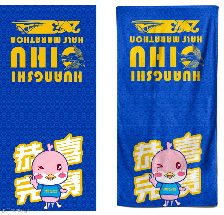正下方印有“黄马”历届吉祥物“黄小燕”的卡通形象,正上方印有2023黄石磁湖半程马拉松英文设计延伸画面。完赛毛巾也可以作为一种纪念品或收藏品,代表着运动员在比赛中的成就和经历。