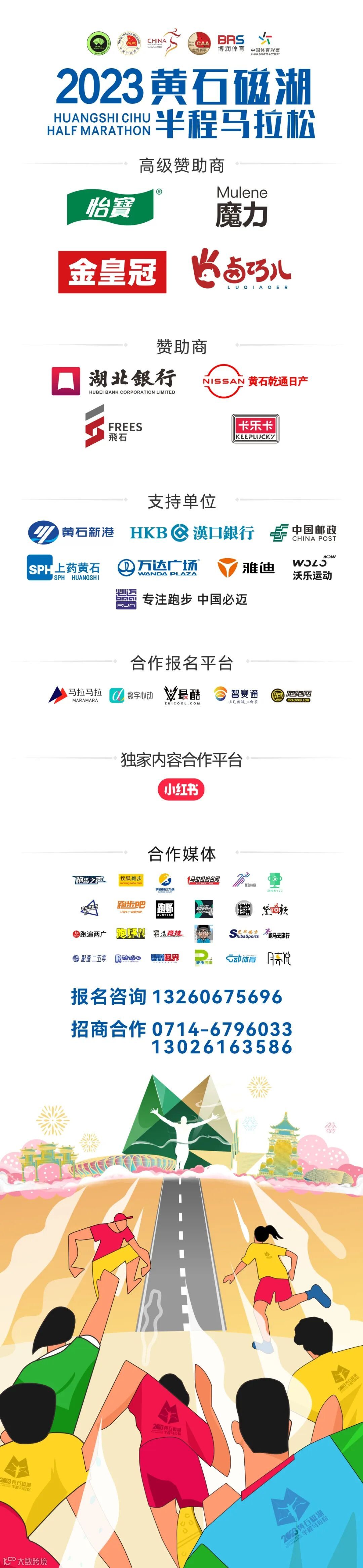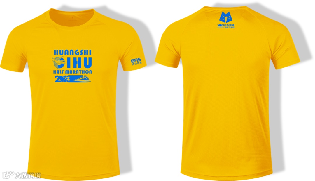 正面采用了“2023黄石磁湖半程马拉松”的英文,并将“C”用小燕子替代,寓意“黄马”暌违三年,重新归来;底部的数字“2023”,则用黄石新的城市地标——有轨电车形象来代替,让整个服装更有设计感,服装反面则印有2023黄石磁湖半程马拉松赛事LOGO,突显主题元素。