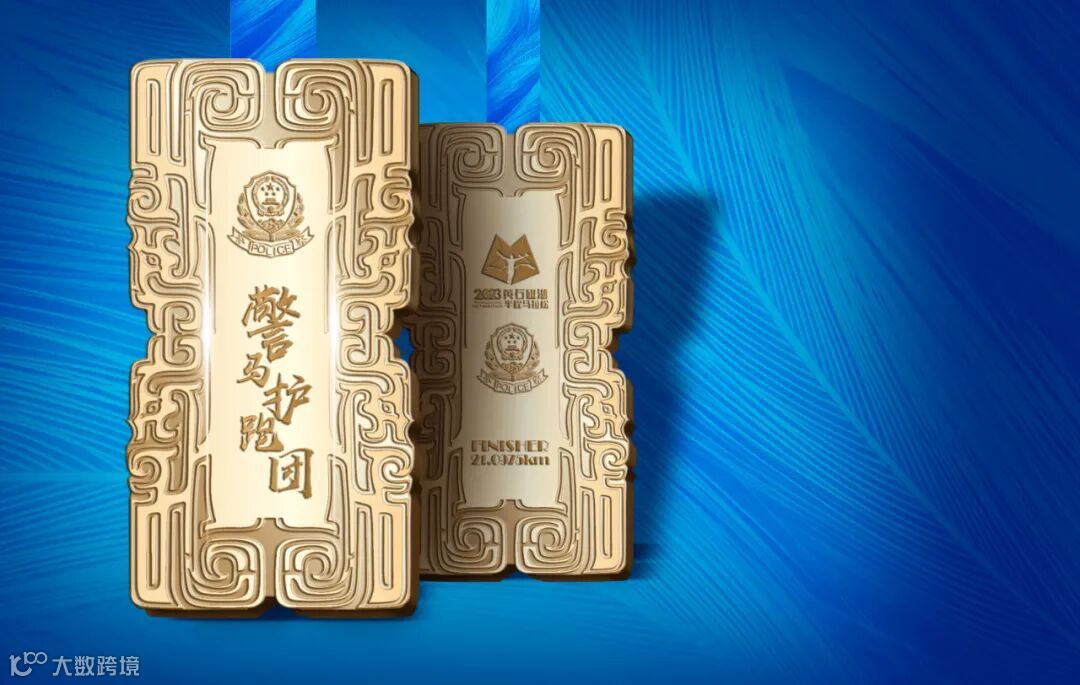 警马纪念奖牌整体造型为盾牌,正面有“警马护跑团”的文字,反面有2023马拉松的主题信息。