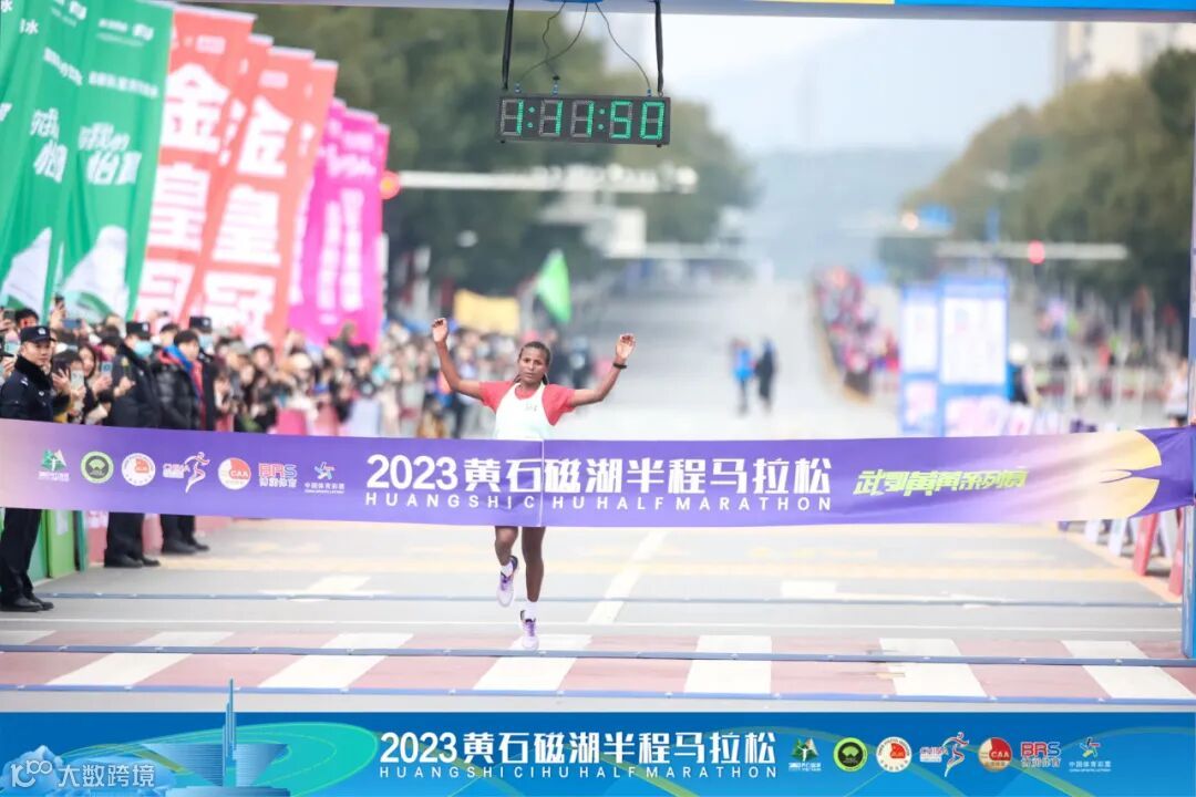 参赛号码“S105”的选手GEDEFA YALGANESH ESKAMECH以枪声成绩1小时11分50秒获得2023黄石磁湖半程马拉松的马拉松女子组项目冠军,该成绩打破了上一届(2019黄石磁湖半程马拉松赛)马拉松女子组项目冠军Wibieh Anchalem Haymanote创造的1小时14分18秒成绩的赛会纪录。
