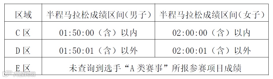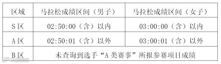 其中S区为马拉松项目优秀选手,A、B区为马拉松项目大众选手,C、D、E区为半程马拉松项目选手。赛事当天请选手按对应区域进行检录和集结,分枪,分区成绩区间设置如下。