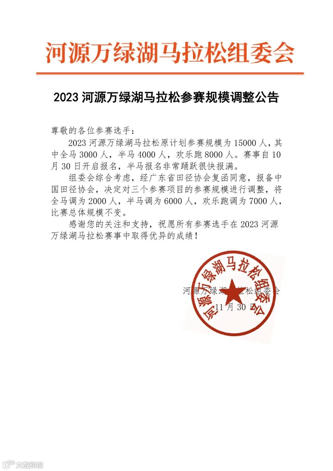 组委会综合考虑,经广东省田径协会复函同意,报备中国田径协会,决定对三个参赛项目的参赛规模进行调整,将全马调为2000人,半马调为6000人,欢乐跑调为7000人,比赛总体规模不变。