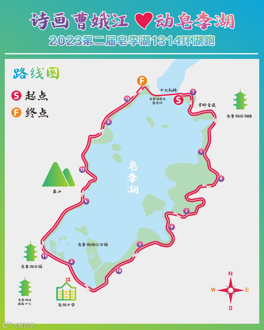 选手在活动当天8:30前于皂李湖十七孔桥处集合,通过任意第三方运动APP(咕咚、KEEP、悦跑圈、咪咕善跑等)进行记录、截图。完成13.14公里环湖跑后,将活动主题“诗画曹娥江,心动皂李湖”+打卡照片及跑步公里数截图发送到朋友圈,经组委会工作人员审查无误,即为完赛。确认完赛后可凭参赛号码布在活动完赛区领取完赛物资。