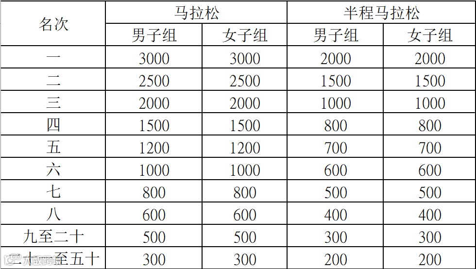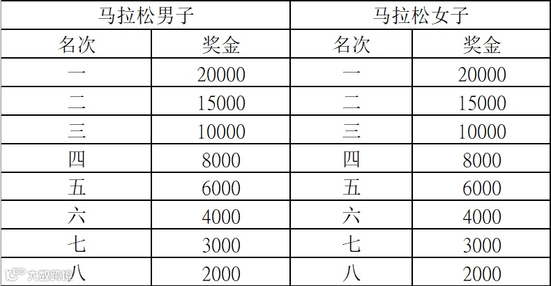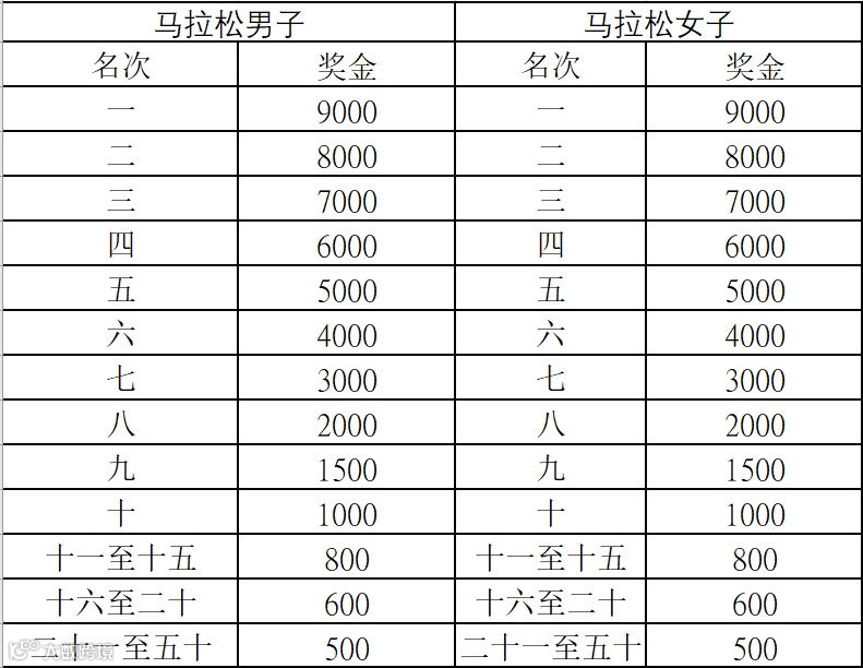 (1)马拉松男、女前八名选手,分别获得奖金(人民币,见下表);男、女前三名各发奖杯一座、奖牌一枚。