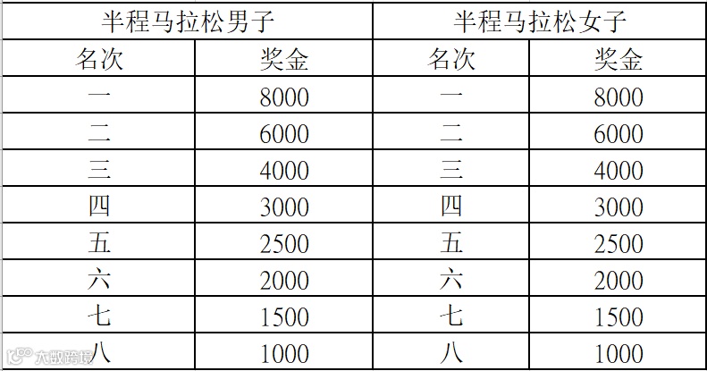(1)半程马拉松男、女前八名选手,分别获得奖金(人民币,见下表),男、女前三名各发奖杯一座、奖牌一枚。