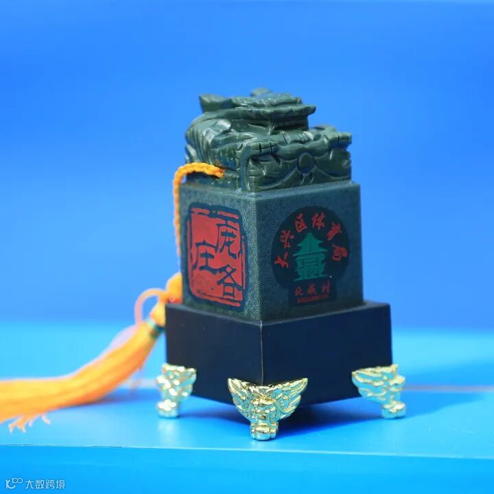 中华民族都是龙的传人,所以印章图形以宋代失传的帝王龙玺为主题原型,加以变化设计,更显得威武霸气,彰显“河马”威武之气,印章印文为篆书:贰零贰叁永定河马拉松赛奖,印文中心部分:一把火炬,两个火苗,三条圆形跑道,寓意:一生二 二生三 三生万物,预示“河马”赛事逐年逢勃发展,火炬象征离火九运兴旺之势,亦有星星之火可以燎原的含义,预示着“河马”赛事一年更比一年好,印章为方形,中间跑道为圆形,寓意:“天圆地方”,天圆~代表着运动,地方~代表着静止,象征“动与静”的完美结合,用以纪念首届“河马”大赛盛事,弘扬“永定河文化”,极具收藏价值。