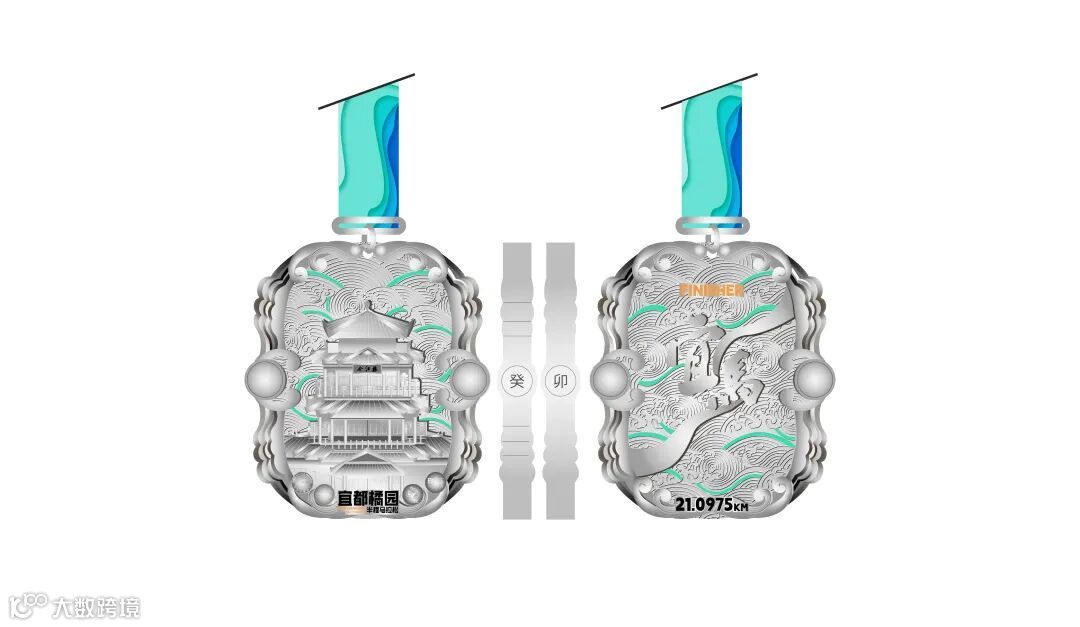 奖牌正面以宜都清江与长江交汇岸边的望江楼为主体,以碧波水纹为背景,使参赛选手彷佛置身望江楼上,化身文人墨客远眺千里,两岸风光尽收眼底。背面”宜马”书法字体,条玉带串连,拟喻选手冲刺时的场景,悦动,精气神。侧面的癸卯二字,正是2023年今年。整块奖牌以云纹做包裹,可谓“云深不知处,碧波交相缠,楼上望江客,两岸皆入墨”。