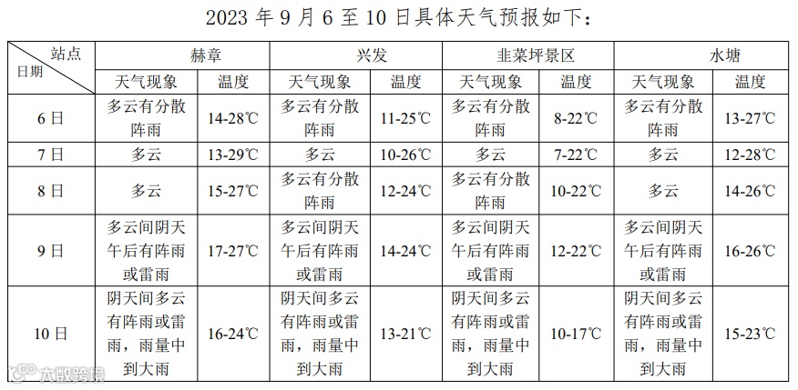 (1)比赛期间赫章县以多云天气为主,9月9日—9月10日有雷雨天气,雷雨中可能伴有局地大风,请注意防范雷雨及局地大风天气对赛事的不利影响。