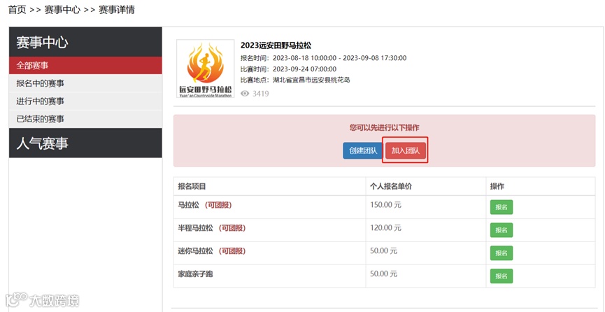 步骤一:没有加入团队的选手,找领队拿到团队ID后登陆个人账号进入团报页面,点击加入团队,进行赛事报名