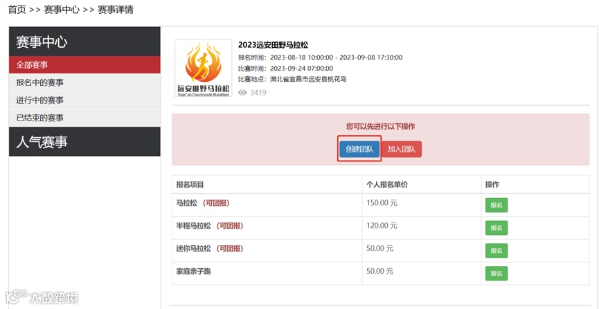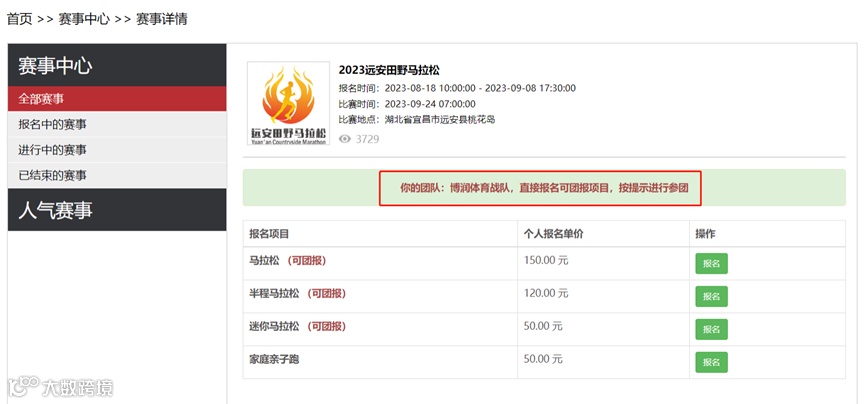步骤一:进入对应赛事报名页面,选择需要团报的项目,如马拉松项目,点击报名