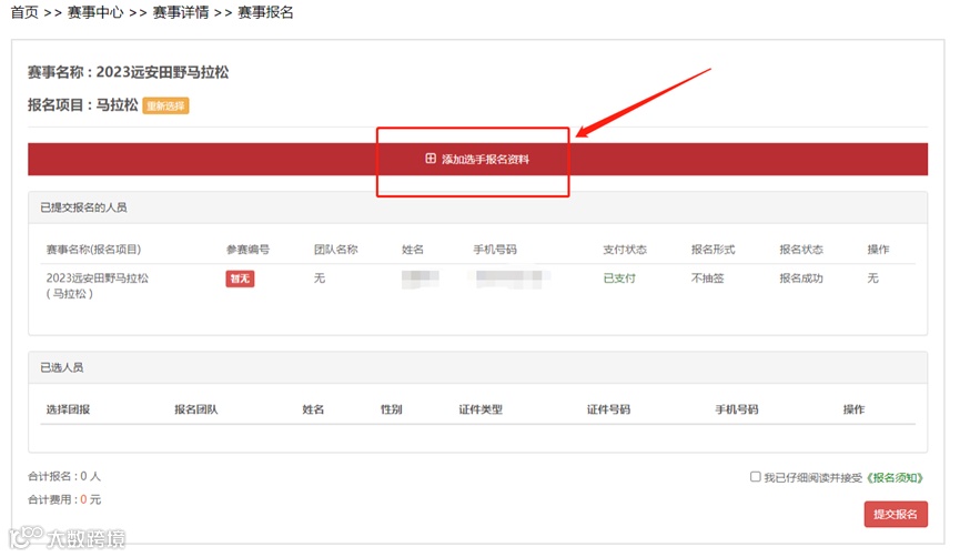 步骤二:进入赛事报名页面后,点击添加选手报名资料