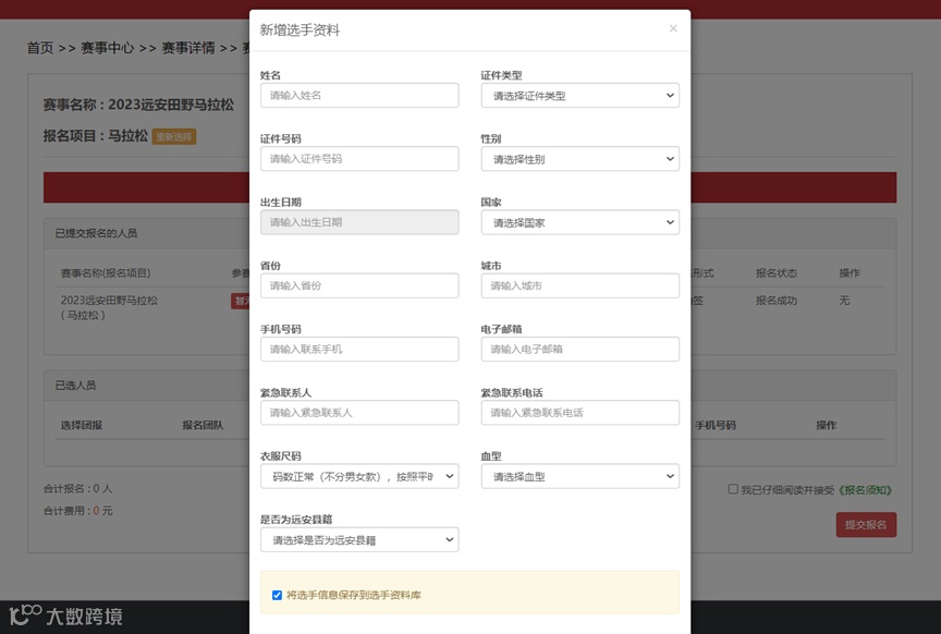 步骤四:填写新增选手个人资料,如姓名、证件信息、联系方式等信息后点击保存