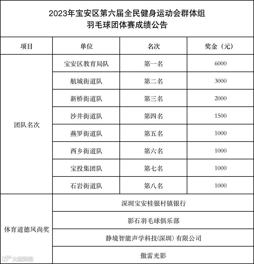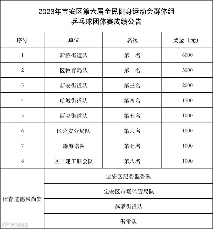 获奖队伍名单将公示10天(2023年9月27日截止),如无异议,组委会将在公示结束后10个工作日内通过转账的形式发放奖金,奖金将征收20%个人所得税,由宝安区第六届全民健身运动会组委会代收代缴。