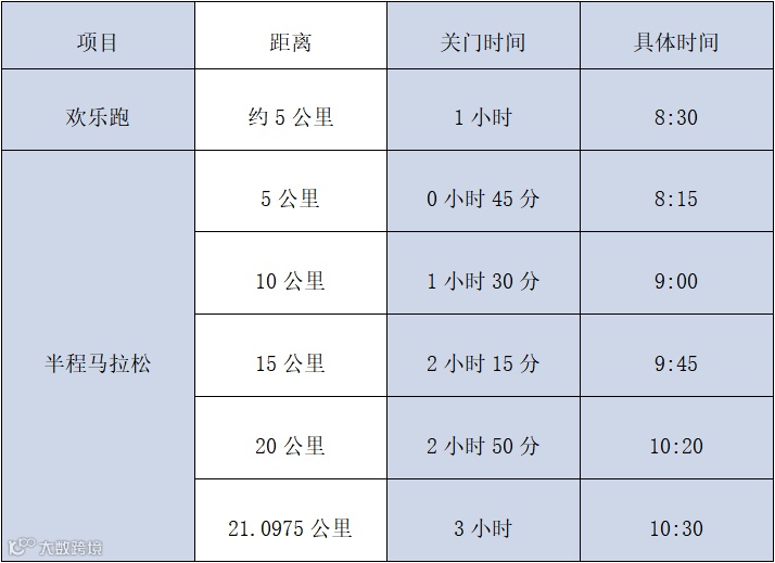 各项目关门距离和时间(以7:30赛事起跑时间为准):