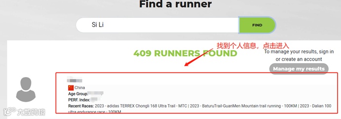 在下方检索结果中找到符合个人资料的信息栏,然后点击进入个人页面(注意:这边有可能有完全重名的,这个时候就需要点开个人页面,结合年龄、国家和参赛经历,来确认是否是自己的个人信息页面),同时在这个页面中可以看到自己的Performance Index(个人表现分)和参赛信息等
