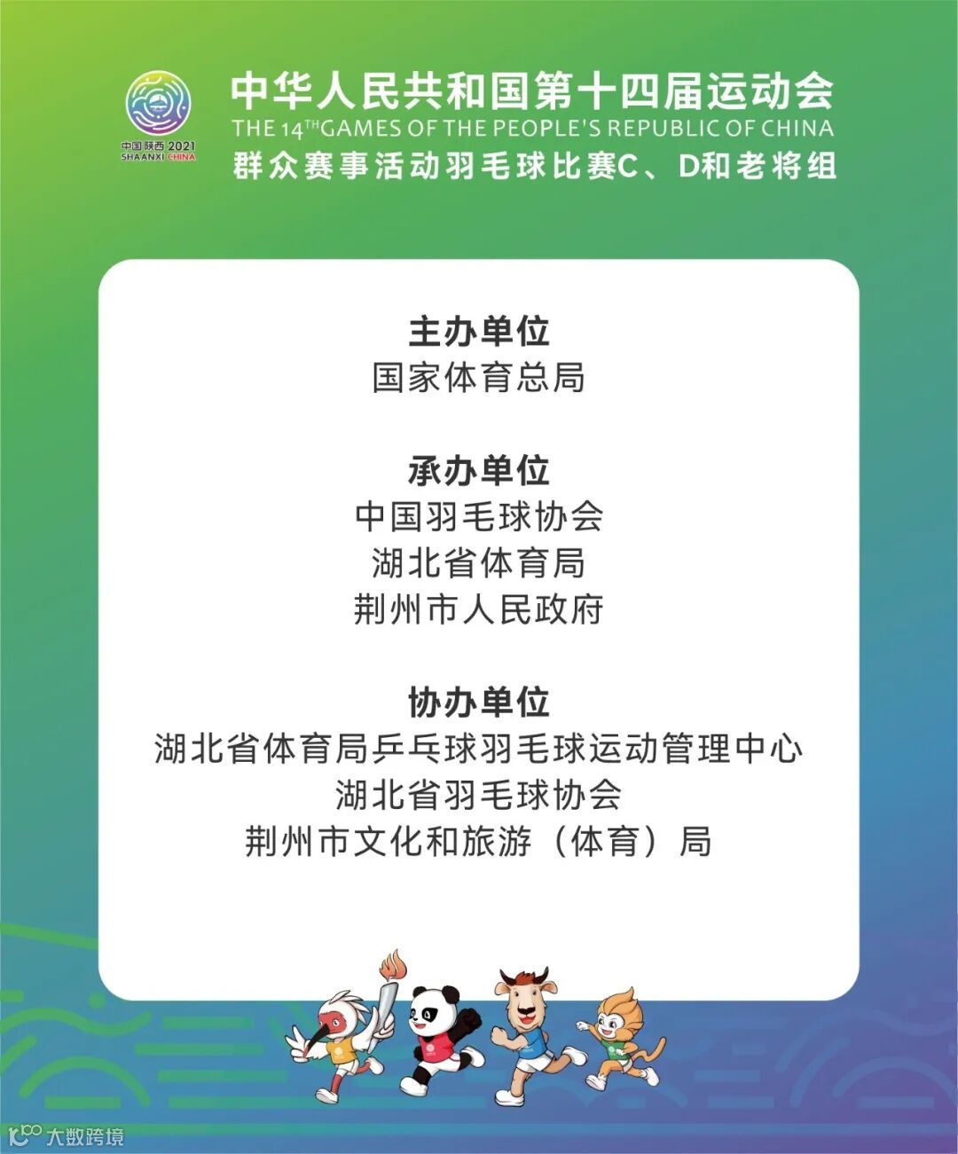 本次赛事由国家体育总局主办,中国羽毛球协会、湖北省体育局、荆州市人民政府承办,湖北省体育局乒乓球羽毛球运动管理中心、湖北省羽毛球协会、荆州市文化和旅游(体育)局协办,广州博润体育科技有限公司运营。根据赛程安排,5月23日,各代表队将来荆报到,5月24日将召开领队会和抽签仪式,5月25日上午将举办开幕式。