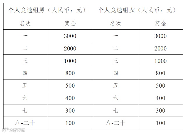一、个人竞速组按照枪声计时成绩录取男女前3名,按照净计时成绩录取男女8-20名进行奖励: