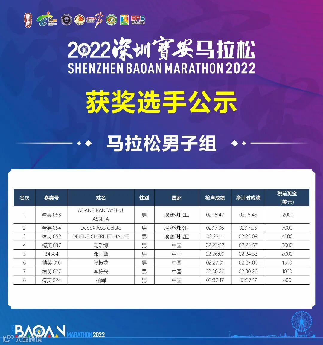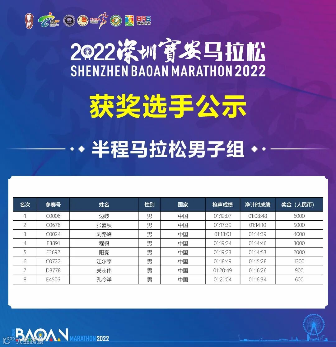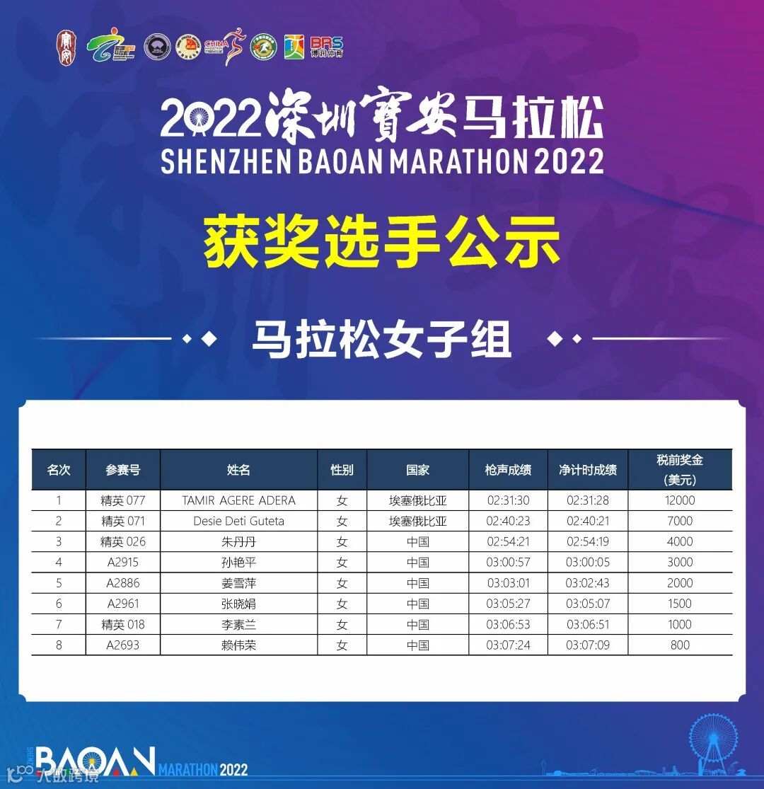 2023年3月19日,2022深圳宝安马拉松于圆满结束。根据竞赛规程,本届比赛马拉松男、女,前八名以枪声成绩进行排名决定奖励名次;半程马拉松男、女前八名以净计时成绩进行排名决定奖励名次。相关事项公示如下:
