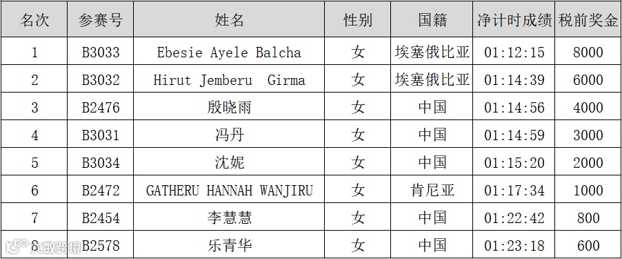 半程马拉松前八名以净计时成绩进行排名奖励