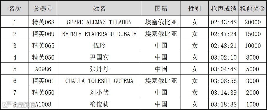 马拉松前八名以枪声成绩进行排名
