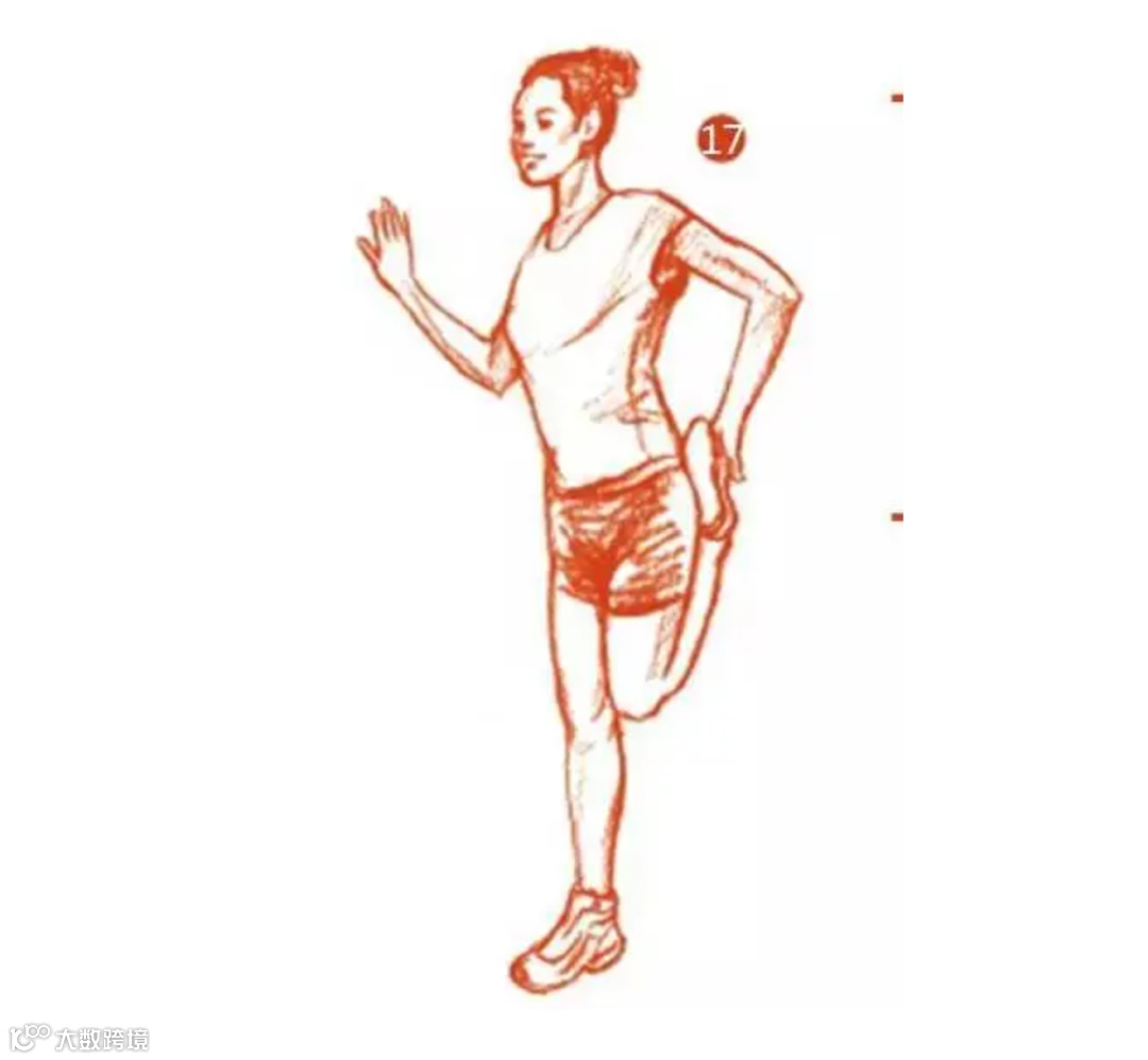 大腿肌肉拉伸:站立,将左腿向后抬起,用右手抓住左脚踝,让腿部伸展,直到感到大腿肌肉有拉伸感。保持姿势约10-15秒钟,然后放松,再换另一条腿。