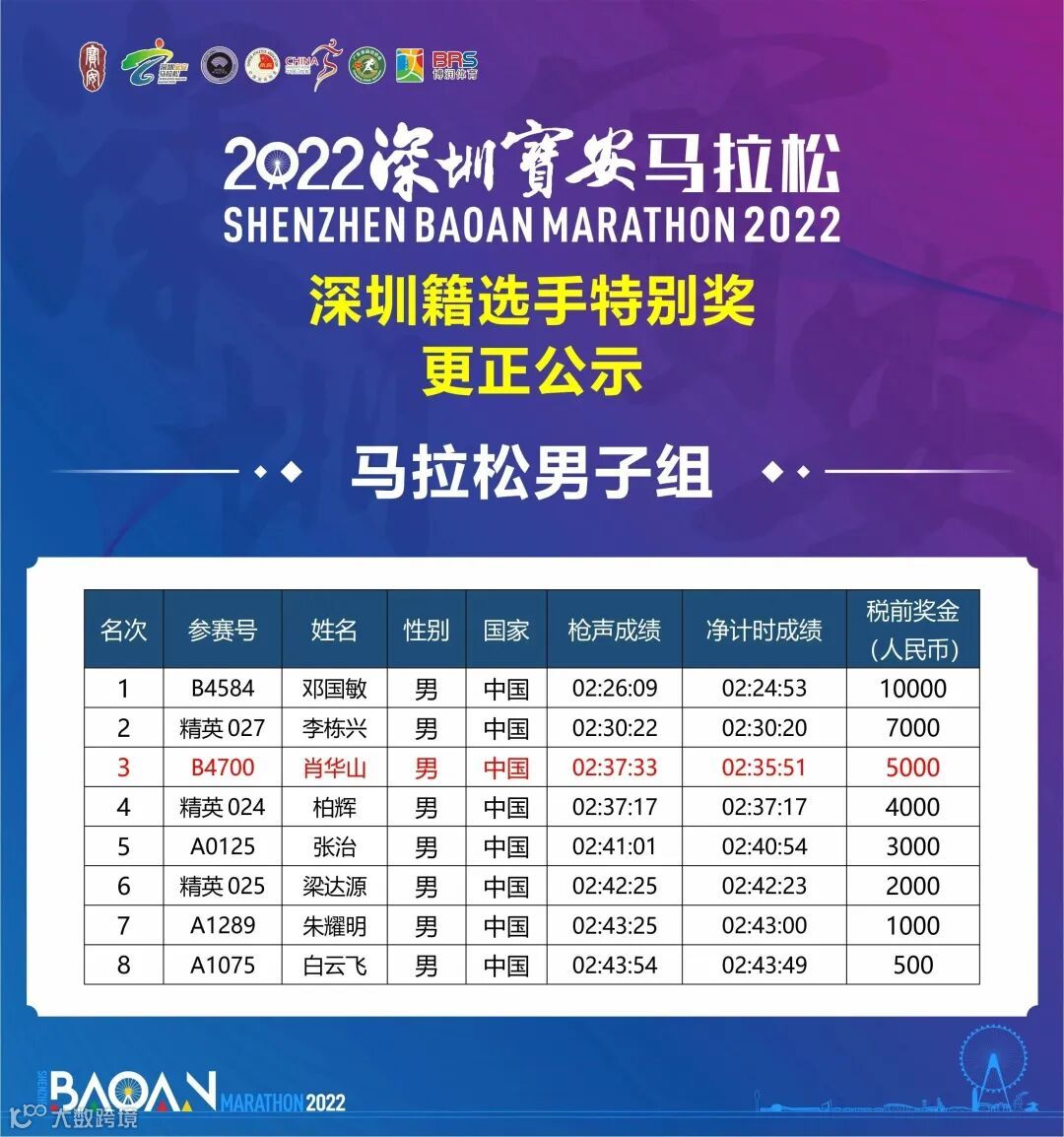 在公示期内,有2名参赛选手对此名单提出申诉,经组委会核实,确认申诉情况属实。因此新增深圳籍获奖选手(男子组)B4700肖华山。更正后排名:B4700肖华山成绩排名第三名,其他名次往后顺延一位。新增深圳籍获奖选手(女子组)A2915孙艳平。更正后排名:A2915孙艳平成绩排名第一名,其他名次往后顺延一位。
