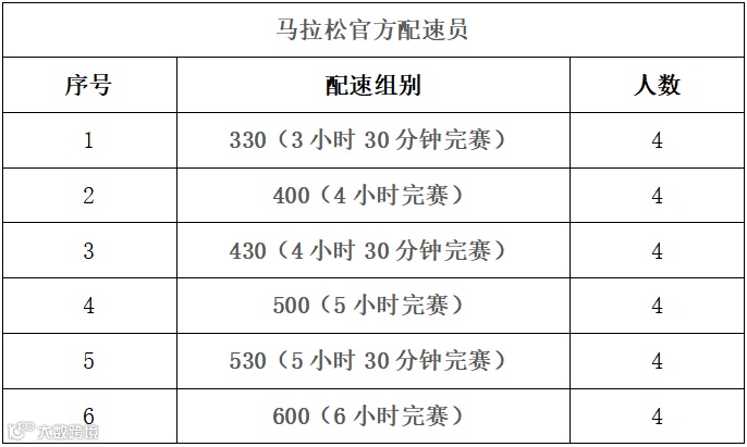 招募全程马拉松官方配速员24人,半程马拉松官方配速员18人,共42名,具体配速分配如下: