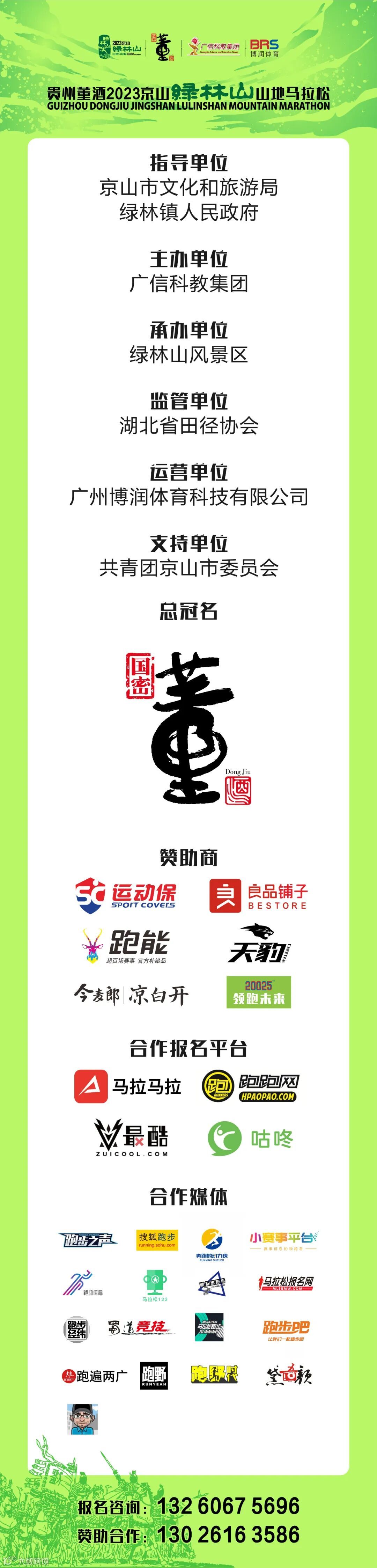 由京山市文化和旅游局、绿林镇人民政府指导,广信科教集团主办,绿林山风景区承办,湖北省田径协会监管,广州博润体育科技有限公司运营,共青团京山市委员会支持的贵州董酒2023京山绿林山山地马拉松,将于2月26日8:00在绿林山风景区游客中心鸣枪起跑。