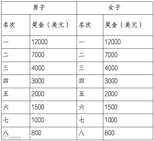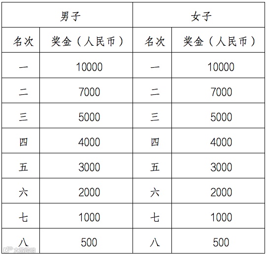 1.半程马拉松男、女前八名以净计时成绩进行排名,分别获得如下表所列的奖金,奖金需缴纳20%的个人所得税。